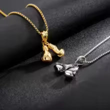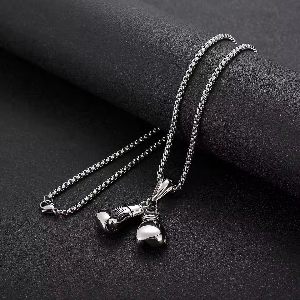 Collar único con colgante de guantes de boxeo, disponible en acabado dorado y plateado. Perfecto para amantes del boxeo y deportes de combate.